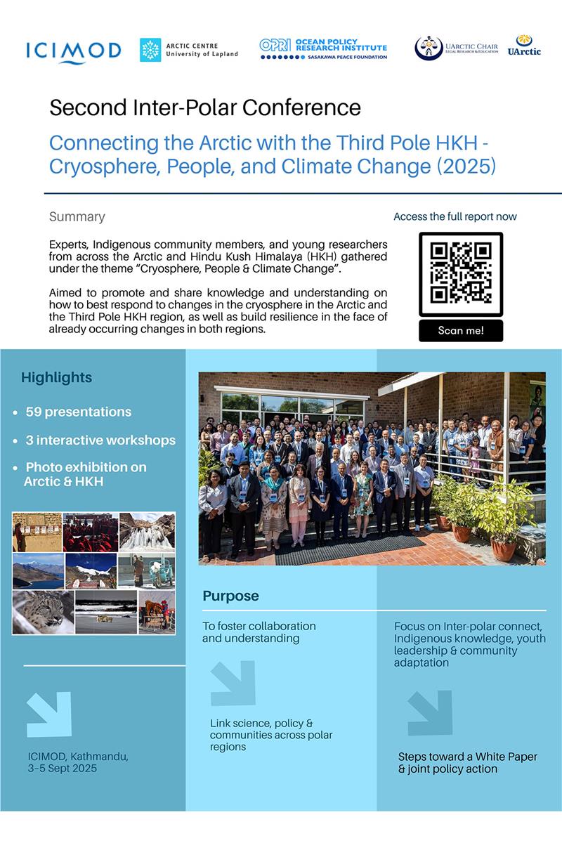 On September 06-09, 2023, the first "Inter-Polar Conference: Connecting the Arctic with the Third Pole,” was held in Kathmandu, Nepal. The Arctic Centre of the University of Lapland and the International Centre for Integrated Mountain Development (ICIMOD) jointly organized the Conference in collaboration with the UArctic Chair in Arctic Legal Research and Education and the Law Thematic Network. With approximately one hundred selected participants from the Arctic and the Third Pole Hindu Kush Himalaya (HKH), including early-career scholars and indigenous voices, the Conference marked a ground-breaking initiative to study the Arctic and the Third Pole together and from an interdisciplinary perspective.