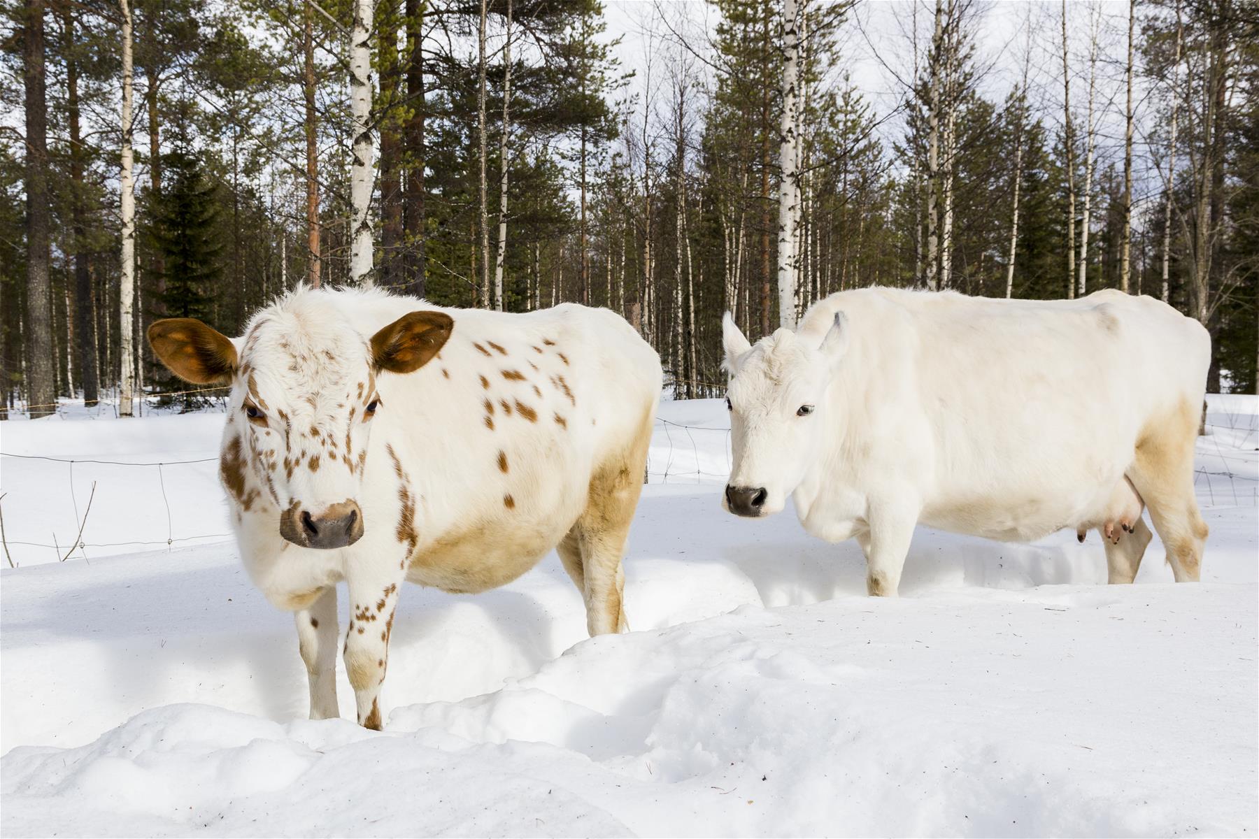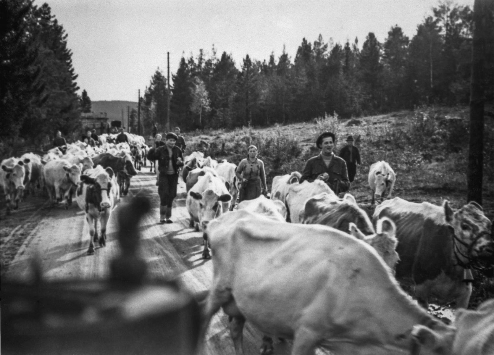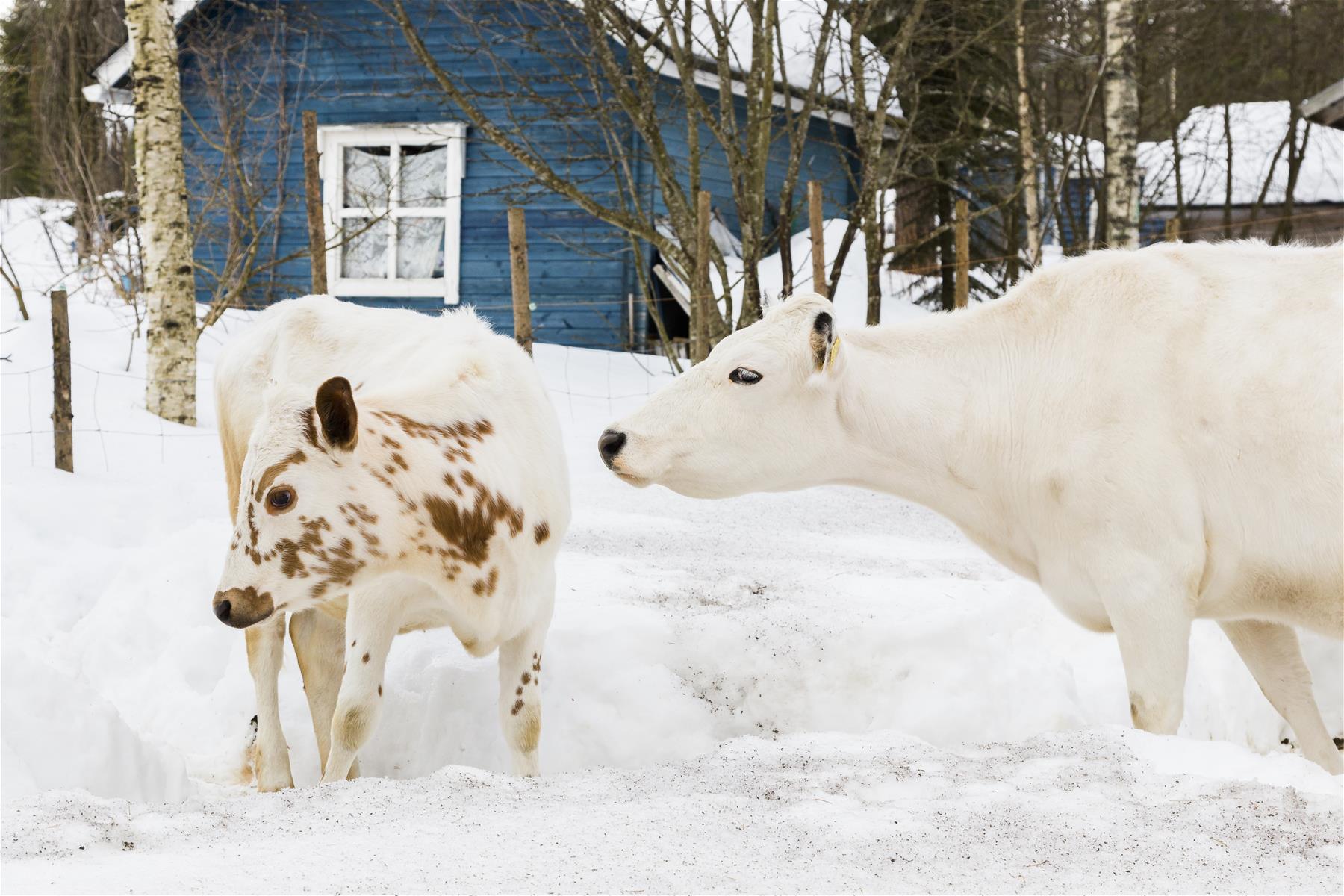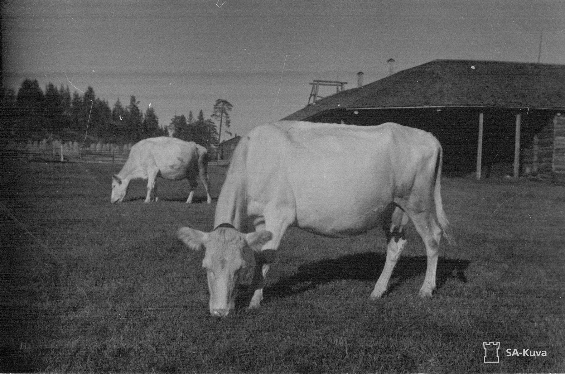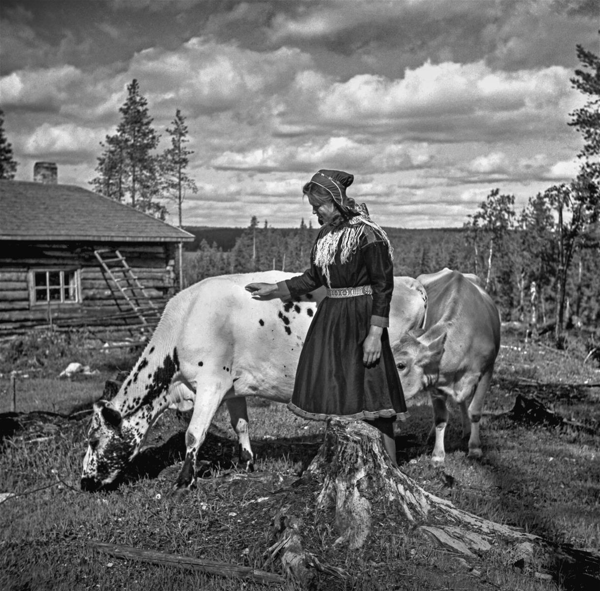 Jouttipalon kämpän pihalla Maarit Holmberg ja lehmät Aallotar ja Rasvikki. Kuvaaja Mauno Tommila, kuvausaika 1943-1944. Lapin maakuntamuseo.