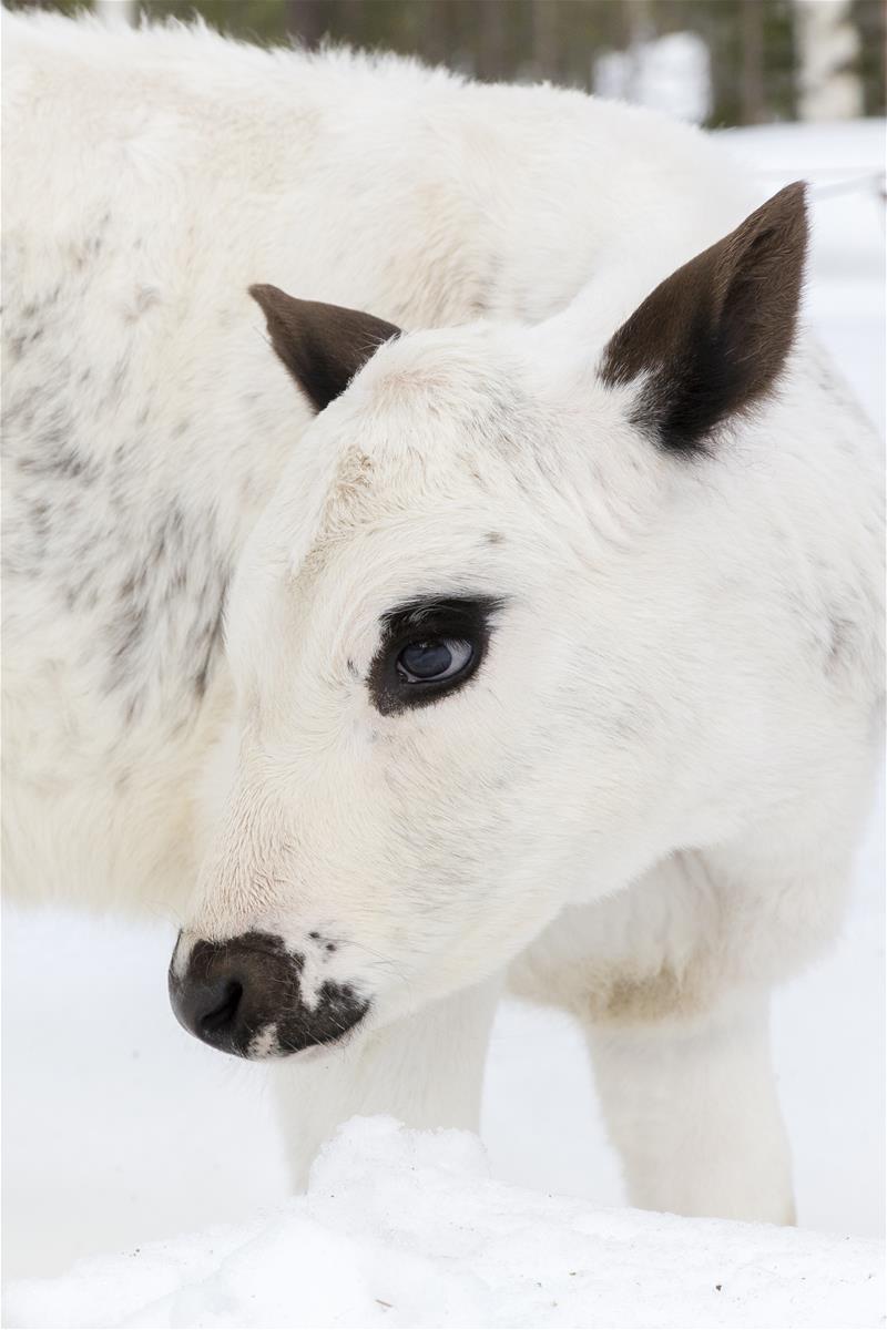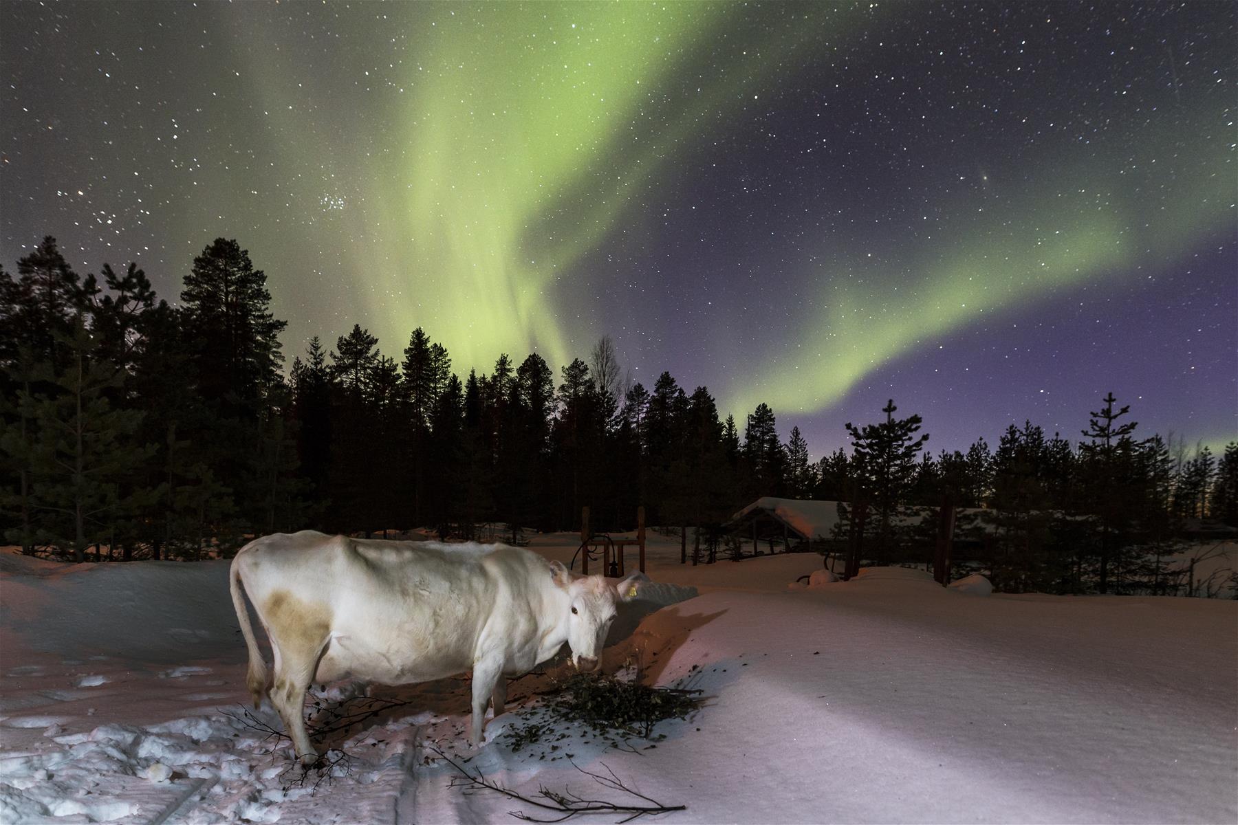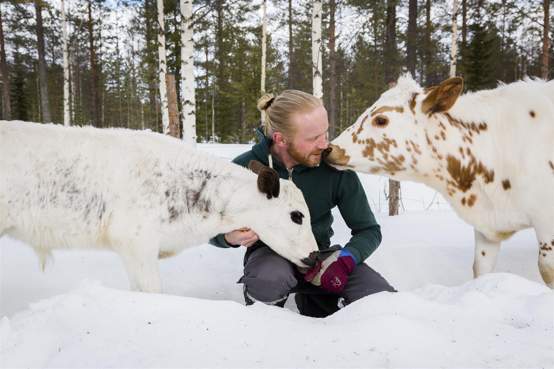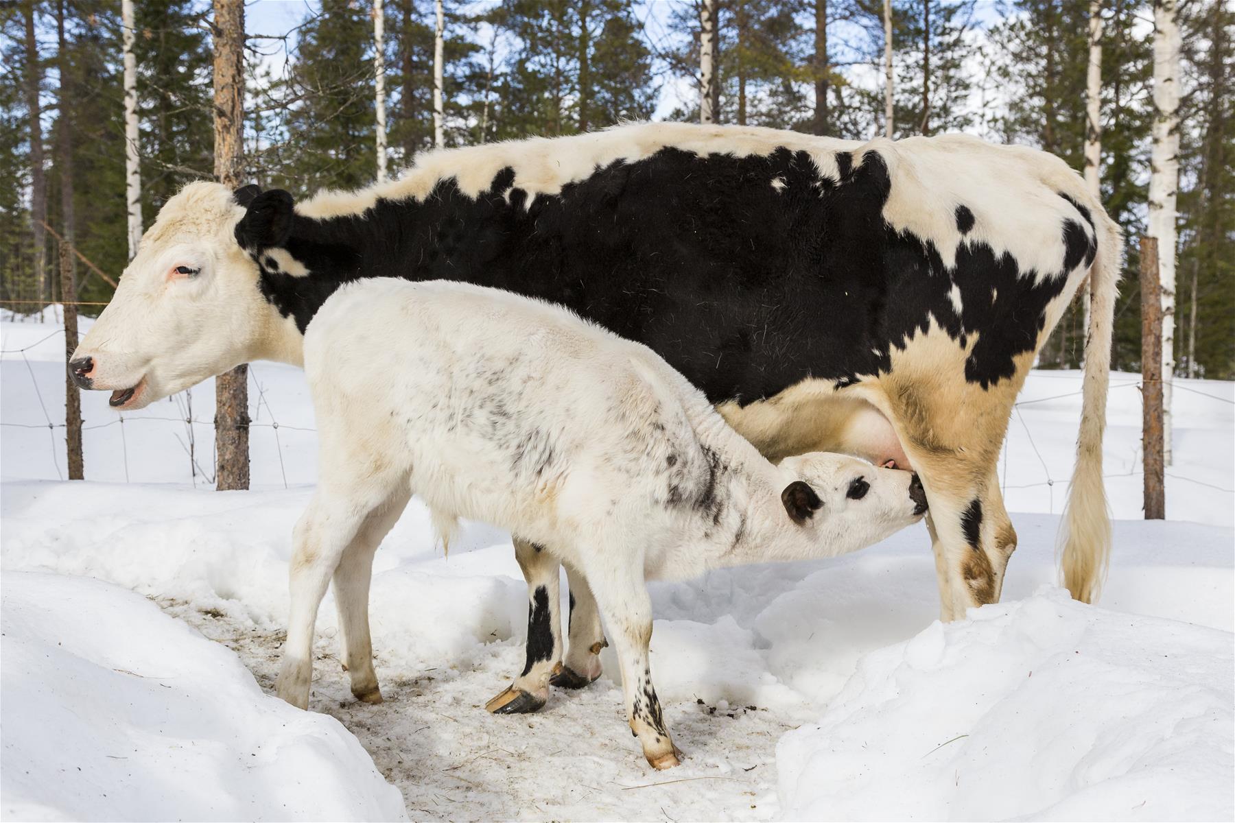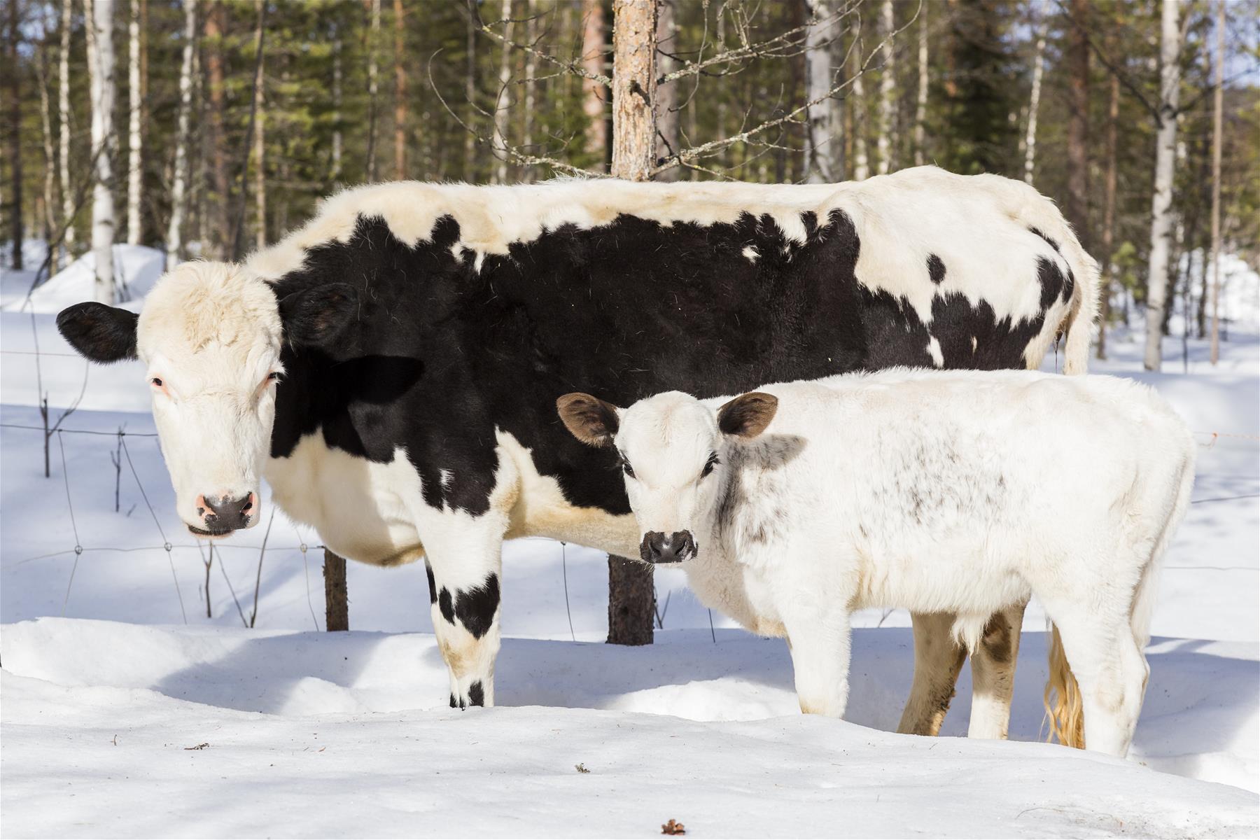 Jouttipalon kämpän pihalla Maarit Holmberg ja lehmät Aallotar ja Rasvikki. Kuvaaja Mauno Tommila, kuvausaika 1943-1944. Lapin maakuntamuseo.