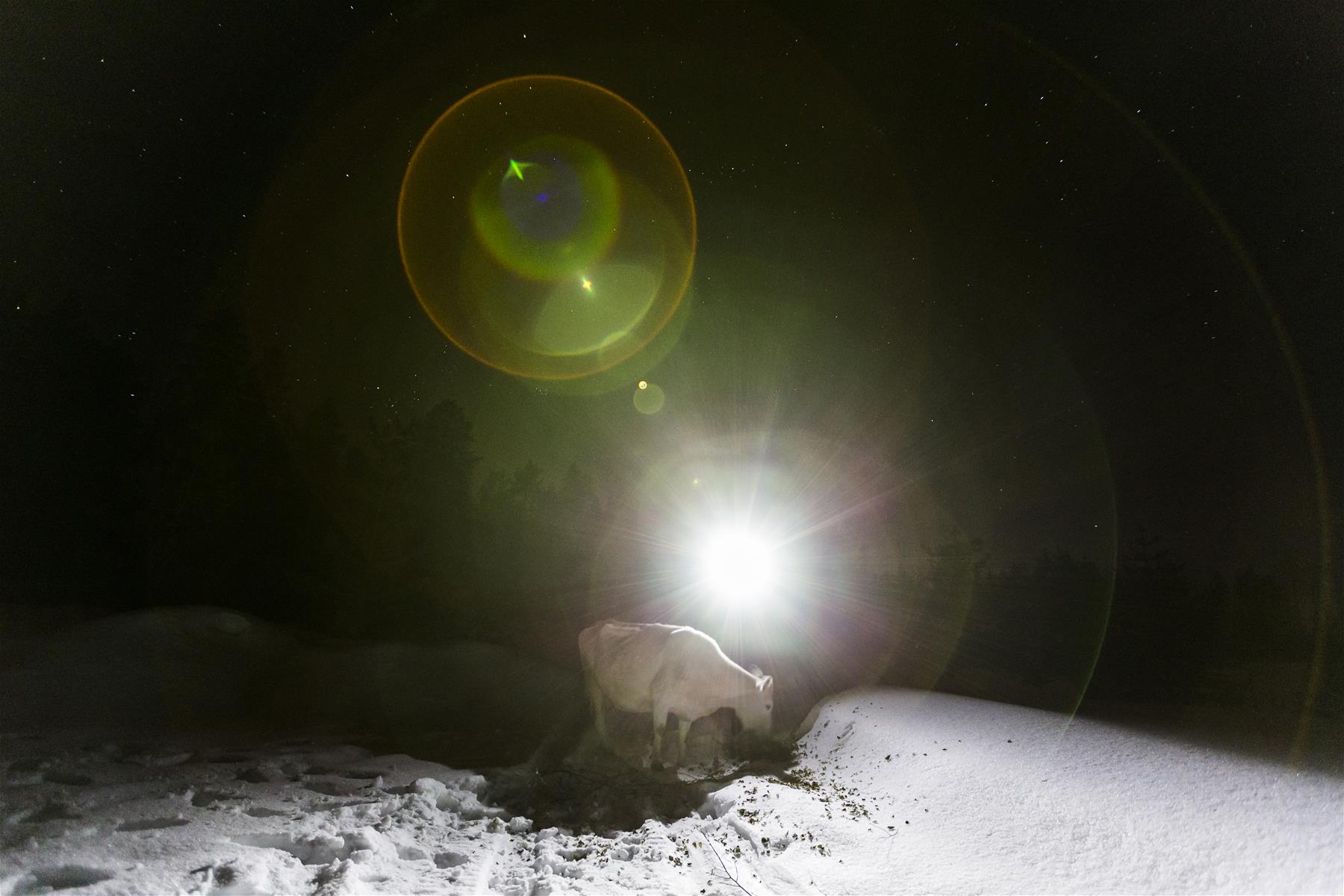 Målåträskin kirkonkylässä, menossa evakkoon. Aino Koskiniemi lypsyllä, tulkki pitelemässä. Kuvaaja tuntematon. Lapin maakuntamuseo.