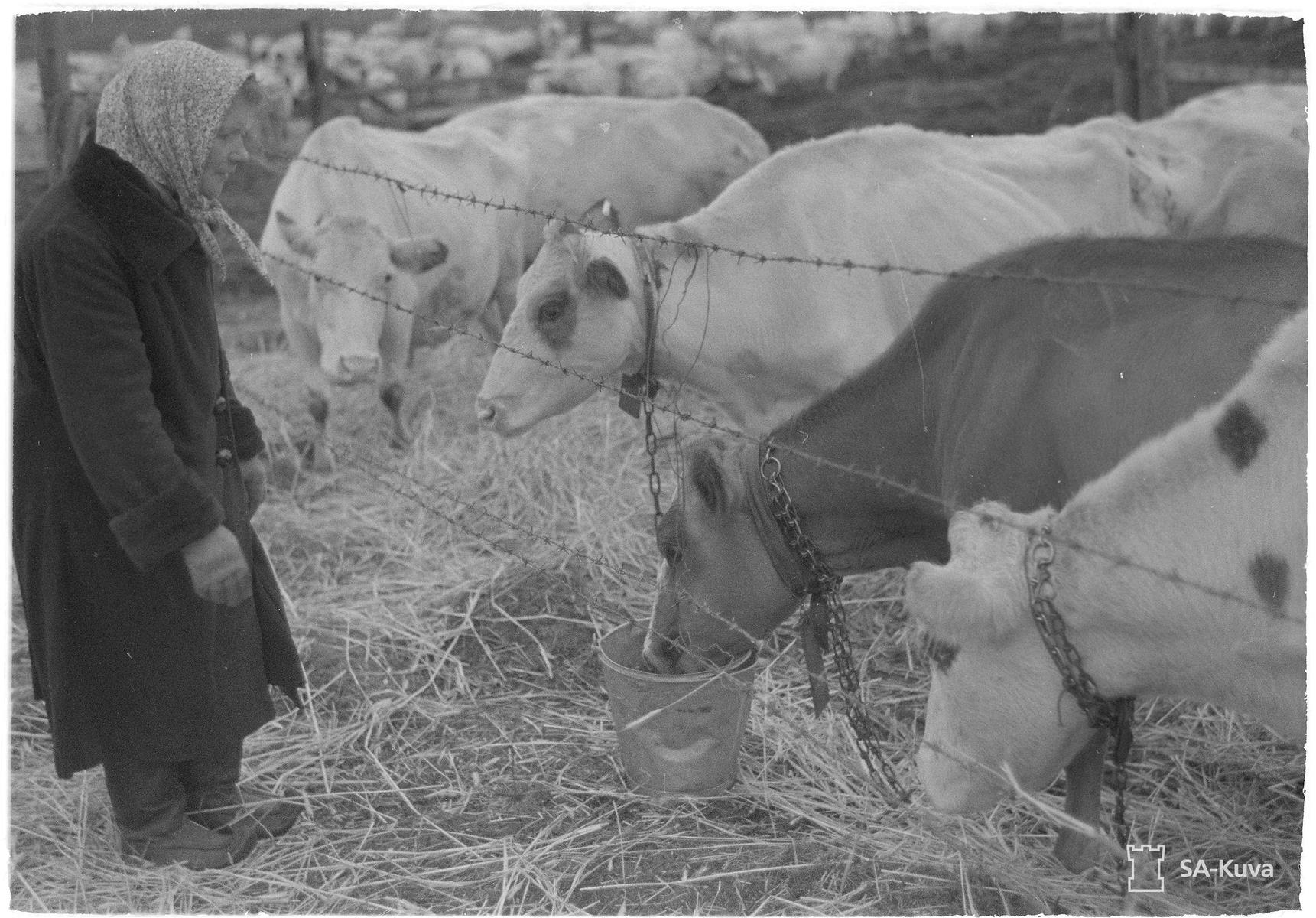 Vanha evakkoemäntä lehmiänsä juottamassa. Haaparanta 19.9.1944. SA-kuva.
